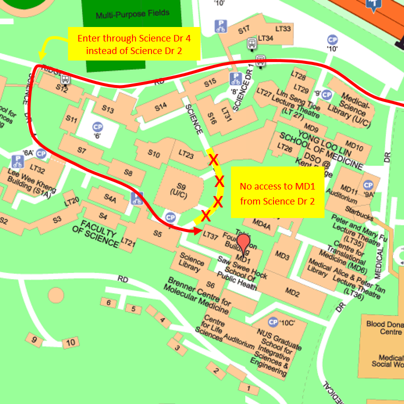 Please note that there is permanently no road access to MD1 from Science Drive 2. Instead, vehicles should take Science Drive 4 to reach the building.